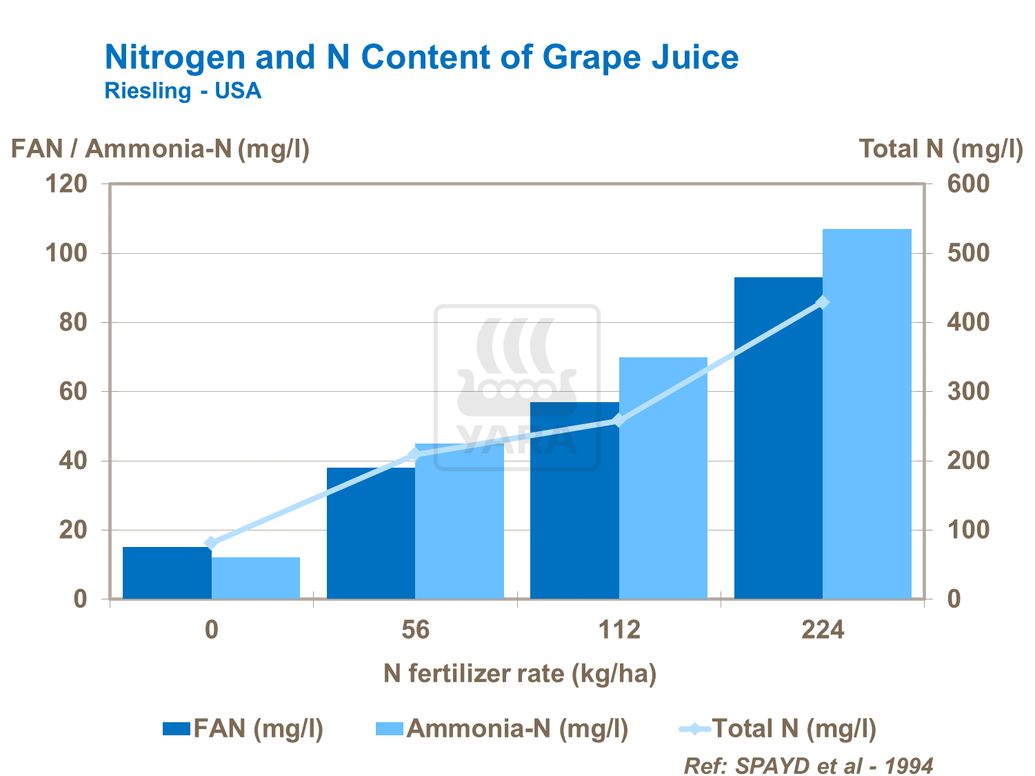 Total nitrogen content, as well as arginine concentration, is directly influenced by application timing of nitrogen fertilizers to the vine. As with potassium, the correct balance of nitrogen for vine growth and grape development is important.