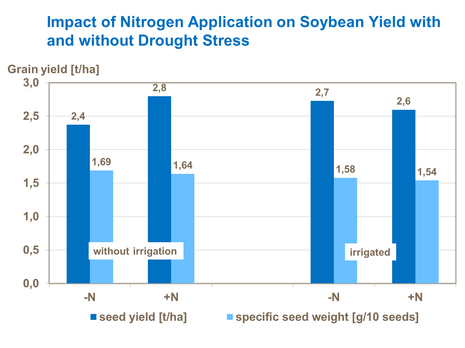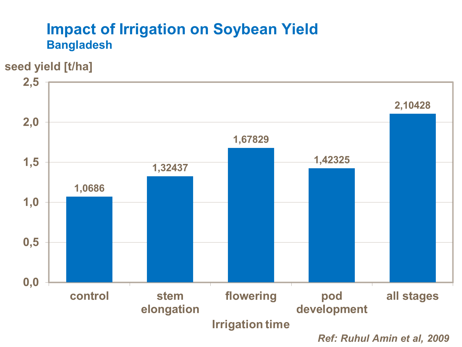 Water requirement of soybean is increasing with plant development, reaching a maximum during flowering and grain filling (7 to 8 mm/day), decreasing after that period. Expressive water deficits during flowering and grain filling may cause physiological changes at the plant, such as stomata closure, winding sheets and, consequently, premature leaves and flowers dropping, pods abortion and yield losses. The total soybean water requirements (in order to obtain maximum yields) varies between 450 and 800 mm/cycle, as affected by climatic conditions, crop management and cycle duration. In order to minimize water deficit effects, it is recommended to use adapted cultivars to region and soil condition; sowing in the right time (less climatic risk) and on adequate soil moisture conditions; adopt management practices that improve soil water storage.