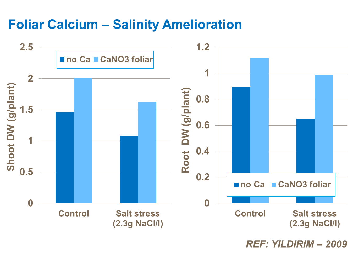 Where salinity is an issue, use of calcium can help to mitigate these effects. In trials, adding extra Ca in a saline situation helps to reduce cellular breakdown and leakage and improve growth and yield. Calcium nitrate or calcium sulfate forms are effective and trials show that they can be applied through fertigation or foliar sprays to help reduce salinity stress.