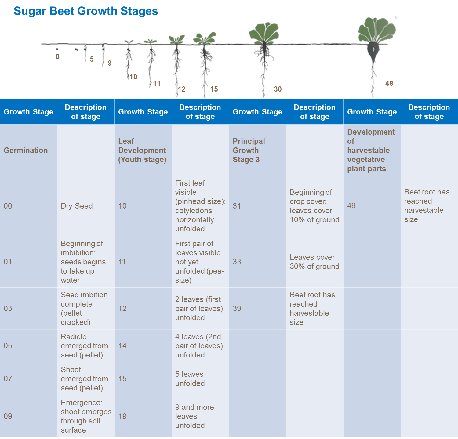 The development of sugar beet can be described in more detail using a growth stage scale system. Below is the scale in detail.