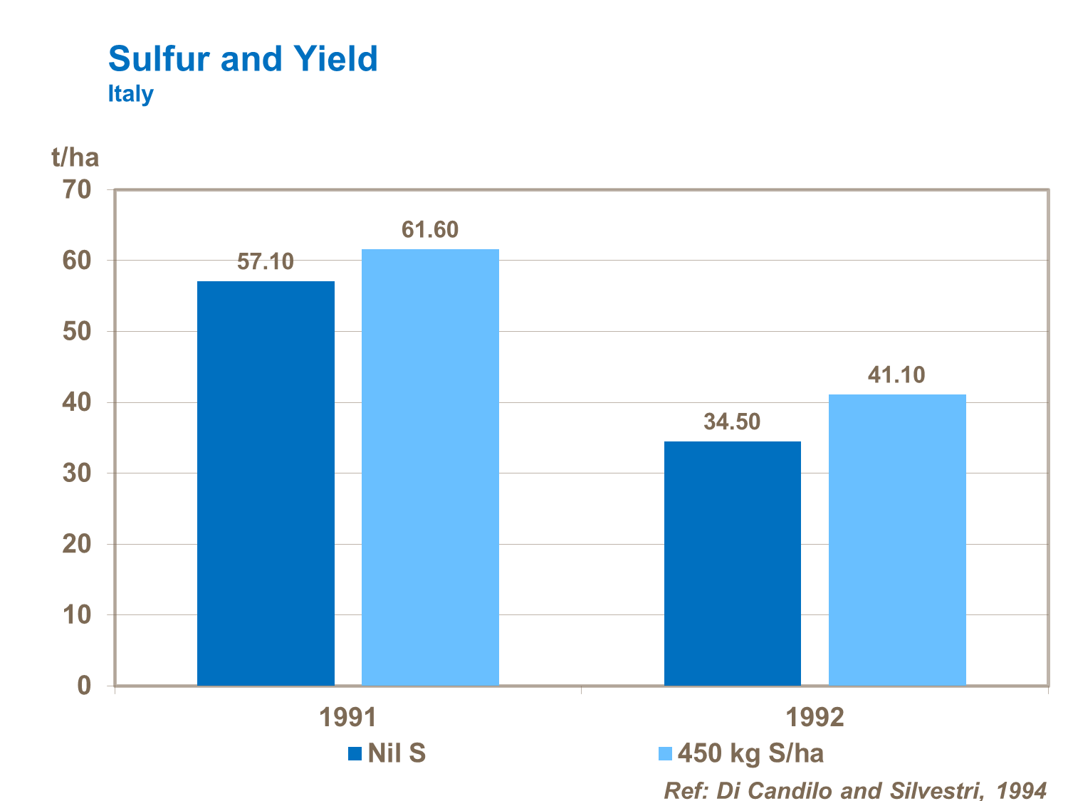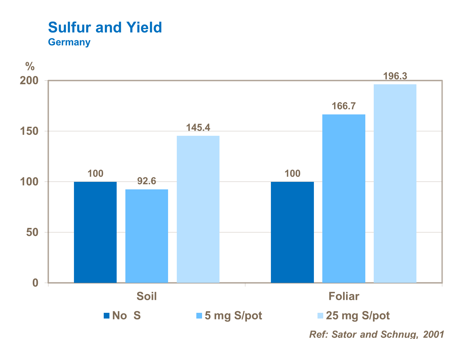 Sulfur is important for overall tomato yield. Sulfur application is required throughout the whole season. Soils are often sulfur-deficient: Foliar applications can be more effective than soil applied fertilizer.